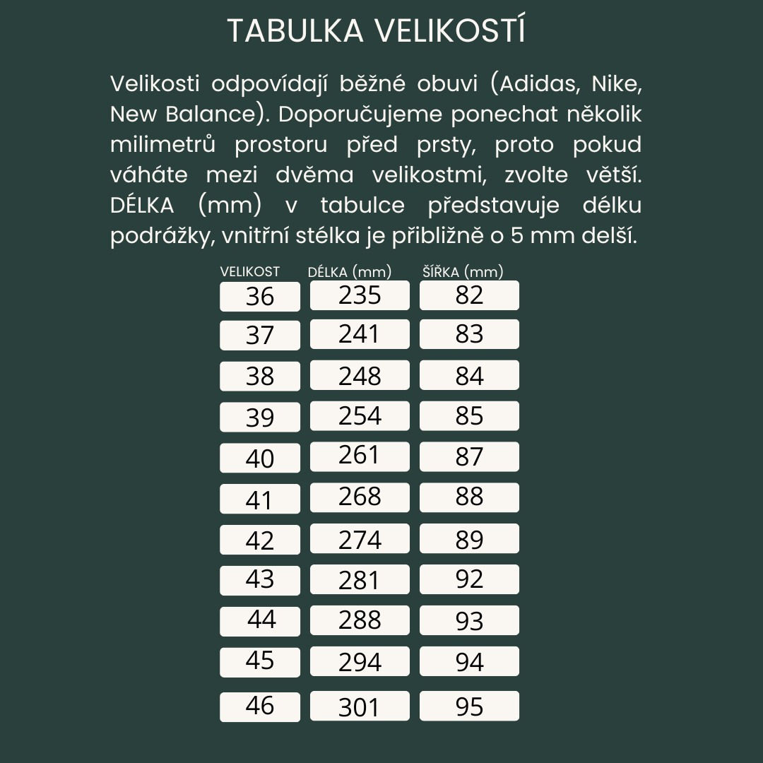 Široká přední část boty poskytuje prstům dostatek prostoru pro jejich přirozenou polohu.