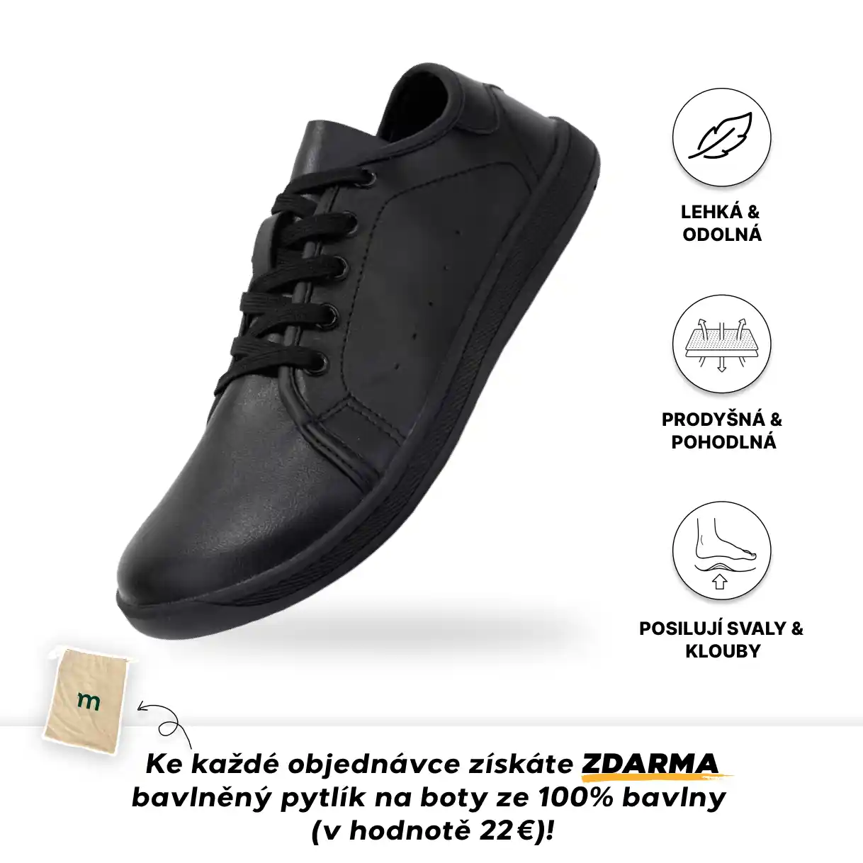 Anatomicky tvarovaná špička umožňuje přirozené rozložení prstů, podporuje správné držení těla a uvolněnou chůzi. Tenká, mimořádně flexibilní barefoot podešev bez zvýšené paty zajišťuje vynikající kontakt se zemí a naprostou svobodu pohybu.